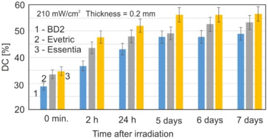 However, very small changes in the DC were observed; hence, this extended the testing of samples over time, even up to 7 days after irradiation (Figure 8). Within 5 days, a further increase in DC by about 10% was observed in relation to the 20 min time originally considered as final. This is a very important observation, indicating a very slow termination process of polymerization.