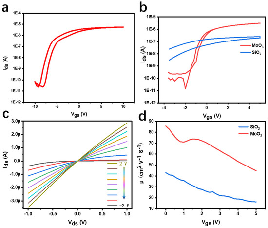 MoS2 FETs using MoO3 nanosheets as the gate dielectric show interesting device performance. Figure 3b shows the transfer curves of MoS2 FETs with different gate dielectric layers. Compared with SiO2 as the gate dielectric layer, it can be found that when the MoO3 nanosheet is used as the gate dielectric layer, MoS2 channel conductance increases with the increase in gate voltage, and obvious on–off current can be observed, showing obvious n-type modulation characteristics, which is caused by the natural sulfur vacancy of MoS2 [24]. Additionally, due to the low gate current leakage of ~10−11 A, this FET exhibits an equally high on/off ratio (~105). However, the MoS2 transistor using SiO2 as the gate dielectric layer cannot achieve obvious on–off state current within the same gate voltage range. By further increasing the gate voltage, we still observe that MoS2 channel conductance increases with increasing Vgs, because a larger Vgs may gradually open the whole channel and increase the conductivity of the whole channel. At the same time, it requires a more negative Vgs to close the channel, and a threshold voltage of approximately −9 V can be observed (Figure 3a). This indicates that MoS2/MoO3 FET has lower starting voltage and lower power consumption. In addition, the hysteresis of a transfer curve is usually used to study the charge trap state at the interface. The change of threshold voltage in the double-scan transmission characteristic curve is usually affected by the charge of the trap state density. It can be found that, with vdW dielectric, ultra-small hysteresis can be observed in the double scan, and the MoS2/SiO2 FET hysteresis window is quite big. According to
