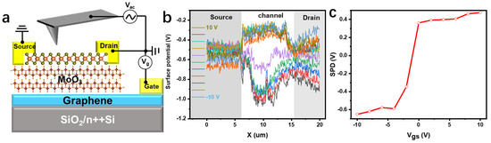 In order to further understand the carrier transport characteristics of heterojunction devices, Kelvin probe force microscopy (KPFM) was used to obtain the function of the surface potential position along the channel of the sample. Figure 4a is a schematic diagram of KPFM experiments on heterogeneous junction devices under different working conditions. We fixed the source–drain voltage Vds = 0 V and studied the functional relationship between the surface potential and back-gate voltage (Vgs). As shown in Figure 4b, since both ends of the source and drain are grounded, the corresponding surface potential is 0 V, while the channel has an obvious potential difference. When the gate voltage is between −10 V and −2 V, there is no obvious change in the surface potential difference. When the gate voltage rises to within the range of −2 V–0 V, the surface potential of the channel gradually rises, and then it exceeds the source–drain surface potential, and the potential difference is 0.5 V; the gate voltage continues to rise, the surface potential continues to rise, but the upward trend has weakened. Through the change of surface potential difference and the corresponding transfer curve, it can be found that when the gate voltage is −10 V, the surface potential is the smallest, which means that the contact barrier is low, electrons are prone to transition at the interface, and the source–drain current has a large upward trend. As the gate voltage increases, the surface potential difference rises, so the contact potential barrier is raised rapidly, and it is difficult for electrons to transition at the interface, and finally the rising trend of the source–drain current is weakened.