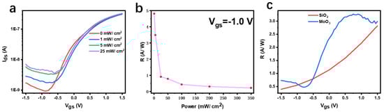 (a) Transfer curves of a 405 nm laser with a different light power in MoO3 medium. (b) The relationship between responsivity and optical power at the same gate voltage in MoO3 medium. (c) The relationship between the responsivity and gate voltage of the two media under the same light power (50 mW/cm2).