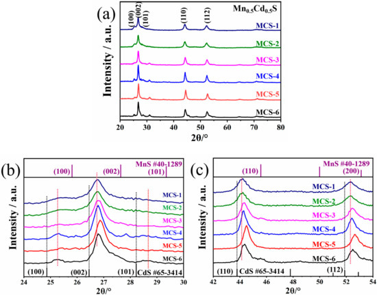In addition, compared to the (100), (002), (101), (110), and (112) diffraction peaks of hexagonal CdS, MCS products slightly shifted toward higher diffraction angles [29]. The changes in the diffraction peaks demonstrate that these products were not a simply MnS/CdS mixture but Mn0.5Cd0.5S solid solution. Due to the fact that the ionic radius of Mn2+ (0.46 Å) is smaller than that of Cd2+ (0.97 Å), Mn2+ can be brought into the CdS lattice or its interstitial sites [4,29]. It is worth noting that when the positions of the diffraction peaks of the MCS-1 sample were marked by red dashed lines in Figure 2b,c, it is clearly visible that with the increase in TAA addition, the offset to high angle of each sample increases and then decreases, reaching the maximum offset at the MCS-5 sample. Combined with the above analyses, it was determined that the dissolution of γ-MnS in CdS crystals varied with the addition of TAA during the present hot solvent synthesis. However, this variation is not a simple positive linear relationship, as the increase in the amount of TAA in a certain range can promote the formation of an MCS solid solution. This positive facilitation may be attributed to the fact that the CdS lattices or interstitial sites are more exposed to the surface with increasing amounts of TAA, providing more solubilization sites for Mn2+. When the TAA addition is large enough, (such as in MCS-6, where the TAA content is 20 times that of Mn2+ and Cd2+ in the system), contact between MnS and CdS is made difficult, thus weakening the promotion effect brought by the exposed lattice or interstitial sites.