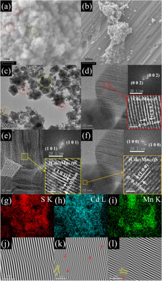 In Figure 3c, it can be seen that the sample mainly consisted of hexagonal nanometre lamellar and nanospheres with lengths ranging from 20 to 200 nm. In addition, a small amount of rod-like morphologic structure can be observed, with a width of about 150 nm. From the HRTEM image (Figure 3d), it can be seen that the lattice spacing (0.332 nm) of the MCS-2 lattice stripe (shown in red square in Figure 3d) is a little lower than the lattice spacing (0.336 nm) of the hexagonal nanometre lamellar CdS (002) plane. Similarly, the other lattice spacing (0.313 nm and 0.355 nm, as shown in the yellow and brown square in Figure 3e,f) is also slightly lower than lattice spacing (0.316 nm and 0.358 nm) of the (101) and (100) plane of hexagonal CdS [4]. Combined with the EDX elemental mapping results in Figure 3g–i, the uniform distribution of S, Cd, and Mn indicates that the reduced lattice spacing of cadmium sulphide is due to the doping of Mn2+ ions in its lattice under the current solvent heat conditions and provides strong evidence for the successful preparation of the Cd–Mn–S ternary phase. In addition, the similar hexagonal crystal phase of MCS-2 and CdS can be demonstrated using the fast Fourier transform (FFT) pattern (inset in the right upper corner of Figure 3d–f).