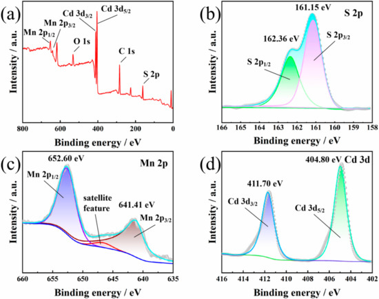 The composition and state of the surface elements of MCS-2 were obtained with X-ray photoelectron spectroscopy (XPS). The Mn, Cd, and S elements were observed in survey spectra in Figure 4a; this provides more evidence of the successful preparation of the MCS composite [4,25,30]. A spin-orbital splitting peak can be seen in Figure 4b, which appears due to the fact that S 2p has a dense spin-orbit component (Δ = 1.16 eV) and the splitting of the subshell layer on its p orbital. Additionally, two apparent symmetrical peaks located at 161.15 and 162.36 eV are ascribed to S 2p3/2 and S 2p1/2, indicating that the S exists in a −2 oxidation state [25,31]. Multiple splitting peaks are visible in the high-resolution Mn 2p XPS spectrum in Figure 4c: the major peaks appear at 641.41 and 652.60 eV, which can be attributed to Mn 2p3/2 and Mn 2p1/2, respectively. At the same time, the satellite peak appearing at 645.98 eV reveals a +2 oxidation state of Mn in the MCS-2 composite [3,30]. As shown in Figure 4d, the peaks that appear at 404.80 and 411.70 eV are ascribed to Cd 3d5/2 and Cd 3d3/2, respectively, indicating that the Cd in MCS-2 presents in the +2 oxidation state [30]. The above binding energies of Cd, Mn, and S are in good agreement with the reported values.