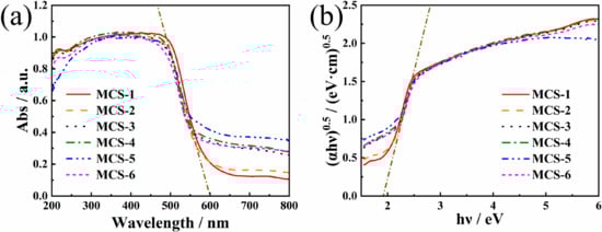 The light-harvesting ability of the catalyst was evaluated through UV-vis diffuse reflectance spectrometry. Figure 6 shows the UV-vis diffuse reflectance absorption spectra and Tauc curves of MCS products, respectively. In drawing the Tauc curves, we finally determined the band gap type of MCS to be an indirect band gap by reviewing the relevant literature [4,26,32] in combination with Figure 6a to make a rough judgment. As can be seen in Figure 6a, all MCS samples have absorption in the 200–800 nm wavelength. Meanwhile, all the MCS samples have a close absorption edge located around 600 nm, corresponding to a bandgap energy of approximately 2 eV. Additionally, the absorption intensity is lower in the range of 600–800 nm, and the mean absorbance is listed in Table 3.