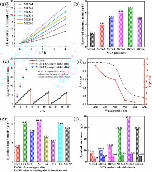 Because the catalytic system formed by high-purity metallic nickel mesh/MCS has the highest increase in hydrogen production, we selected the high-purity metallic nickel mesh and put it into MCS catalytic system under different amounts of TAA addition. In Figure 7f, the results show that the maximum hydrogen production still corresponds that of MCS-5, which is 37.65 mmol·(g·h)−1. When the high-purity Ni metal mesh was placed in each catalytic system, the increase in hydrogen production of each reaction system was not a fixed value but fluctuated between 2.66 and 5.90 (an average increase of 4.20 times). This indicates that the Fermi energy level of the metal is not the only influencing factor in the metal mesh–MCS catalytic system. The characteristics of the material itself, such as the number of active sites and the light absorption capacity in the visible light range will also affect the hydrogen production efficiency of the whole system.