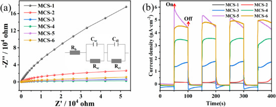 (a) Electrochemical impedance spectroscopy (EIS) and the equivalent circuit of MCS. (b) The periodic on/off photocurrent responses of MCS.