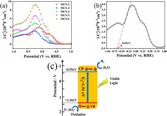 (a) Mott–Schottky curves of different MCS products. (b) Mott–Schottky curves of MCS-2. (c) Energy band diagram of MCS-2 alone.