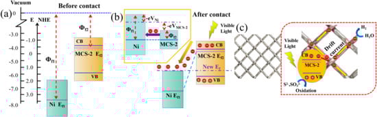 Based on the various characterization and performance results of MCS and metal mesh mentioned above, the photocatalytic mechanism of the whole system was discussed on the basis of the energy band structure. Taking high-purity metal nickel-loaded MCS-2 as an example (Figure 10a), the Fermi level of MCS-2 (−0.45 V vs. NHE) calculated by formula E(eV) = −4.5 − E(V) is higher than that of Ni (−7.98 eV vs. vacuum, obtained from the CASTEP calculation). Thus, when they come in contact with each other, electrons will migrate from MCS-2 to nickel to reach a new Fermi level equilibrium (Figure 10b). When MCS-2 was irradiated by visible light, photoexcited electrons would migrate from the VB of MCS-2 to nickel, while leaving the equal amount of holes in VB. Meanwhile, according to the Fermi–Dirac distribution function, the new equilibrium Fermi energy level of metal nickel/MCS-2 must be lower than the CB of MCS-2, so the photoexcited electrons can be transferred from CB of MCS-2 to nickel. The photoexcited electrons transferred to the high-purity metal nickel mesh directly form a drift current, which concentrates the nickel mesh with electrons and the MCS-2 with holes. Therefore, metal nickel acts as an electron trap to effectively prevent the recombination of the carriers [40,41]. These photoexcited electrons transferred to the nickel surfaces can eventually be trapped by the adsorbed H+ and form H2.