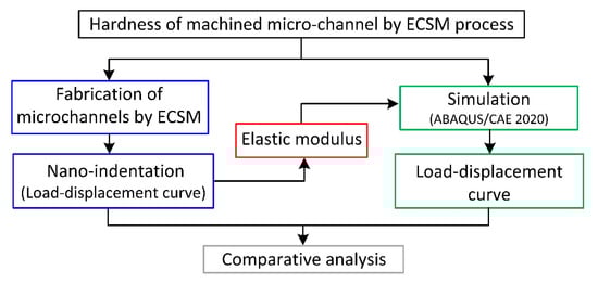 In the current investigation, the nanoindentation behavior of HAZ on ECSM-machined microchannels was analyzed. This work is accomplished in two phases, as shown in Figure 2. In the first phase, microchannels were machined via the ECSM process. Subsequently, the values of Young’s modulus and hardness were determined by a nanoindentation test performed on a TI 900 TriboIndenter. In the second phase, a finite element-based model was created to determine the hardness value through a load–displacement curve. In this model, the value of Young’s modulus was used as received from the experimental results, and the rest of the material properties, such as Poisson’s ratio and density, were kept constant. The Young’s modulus values obtained from the nanoindentation test are tabulated in Table 1.