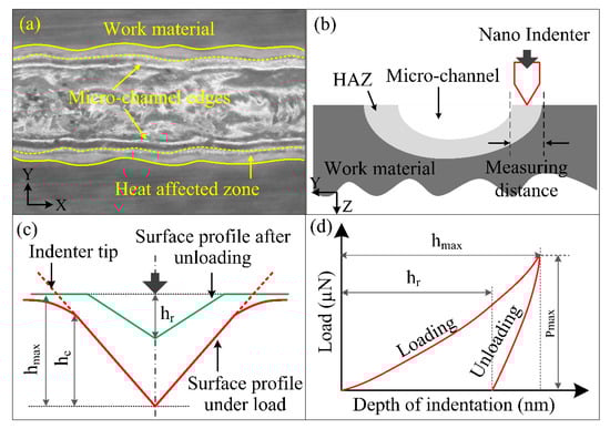 (a) Microchannel machined via ECSM process, (b) measurement methodology for hardness, (c) schematic cross-sectional representation of impression of indenter in work surface, and (d) load–displacement curve.