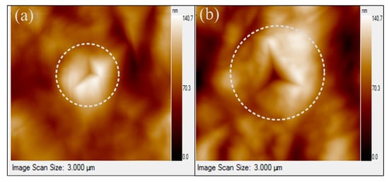 The indenter impressions obtained from the unmachined and machined glass work materials are depicted in Figure 4a,b, respectively.