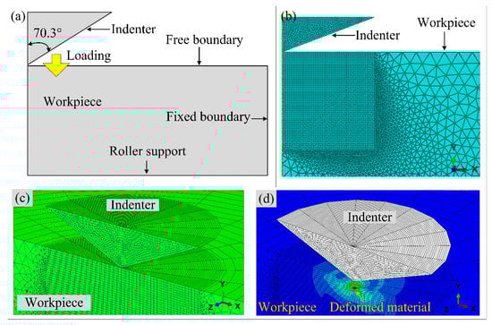 (a) Schematic representation of indenter and workpiece with boundary conditions, (b) axisymmetric mesh pattern, (c) 3D mesh pattern, and (d) deformed work material in 3D view.