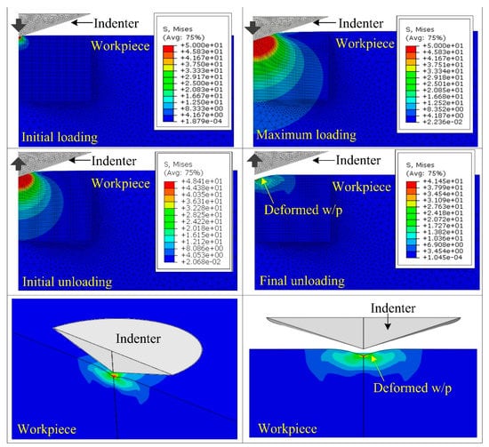 The simulation also provides the stress contours in the determination of equivalent stresses, as shown in Figure 6. As the indenter comes in contact with the work material, the value of equivalent stresses increases immediately below the indenter tip. In the loading stage, the value of equivalent stresses is 50 MPa, which is higher than the glass work material yield strength. As a result, plastic deformation occurs instantly when the indenter tip makes contact with the sample surface. With a further increase in indentation depth, the value of equivalent stress increases in horizontal and vertical directions until the indenter penetrates up to 145 nm depth, as shown in Figure 6. During the unloading stage, the equivalent stresses start decreasing as the indenter detaches from the work material. Hence, the material recovers elastic deformation, and due to the presence of residual plastic deformation, the indenter tip produces impressions on the work surface [26].