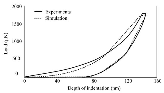 To validate the developed FEM-based model, the simulation and experimental results were compared as depicted in Figure 8b. From this figure, it can be evidenced that the simulation findings were in close agreement with the experimental results. The maximum error obtained was 4.18%, which shows the effectiveness of the presented model in predicting the nanoindentation behavior of glass material.