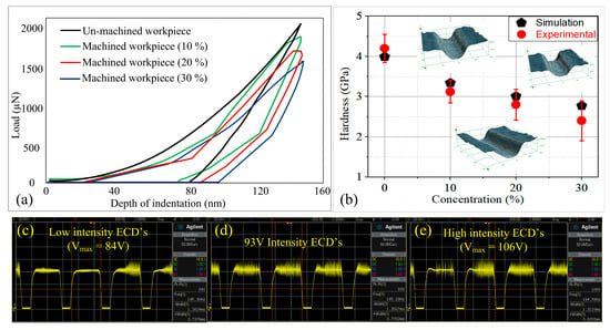 It was observed that the maximum load required to penetrate the indenter for the unmachined glass material is 2079.65 µN. As the electrolyte concentration increased from 10 to 30%, the maximum indentation force decreased gradually. Therefore, the glass hardness was found to decrease by 16.29, 24.56, and 30.58% compared to unmachined glass material, as shown in Figure 8b. The reduction in hardness with the increasing electrolyte concentration demonstrated that ECSM processing softens the work material. This can be understood from the variations obtained in the intensity of the electrochemical discharges (ECDs) for different electrolyte concentrations (Figure 8c–e). The intensity of ECDs is represented by the term Vmax. The increase in electrolyte concentration reduces the interelectrode resistance, which in turn increases the intensity of the electrochemical reactions [15]. Consequently, a thick gas film forms around the cathode, and therefore generates high-intensity electrochemical discharges (ECDs). The increase in thermal energy owing to spark intensity conducts more heat in the surrounding area of the machined features, and thereby softens the microstructures of the glass work material.