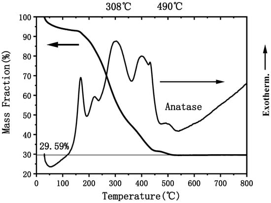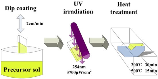 After the sol was prepared, a cleaned transparent conductive glass FTO was used as the substrate, and the vertical pulling machine was used to pull the film from the prepared sol. The pulling rate was 2 cm/min. Then, the film was quickly transferred to a UV lamp for 10 min of UV irradiation to induce monomer polymerization. Finally, the film was transferred to a box-type resistance furnace for heat treatment, which was composed of 200 °C heat treatment for 30 min followed by 500 °C heat treatment for 10 min. After these processes, the TiO