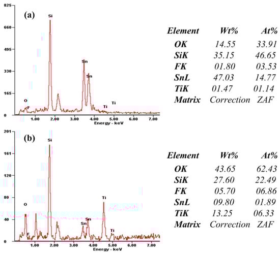 Figure 9a,b show the EDS energy spectrum analysis of the front and cross-section of the FTO substrate after adding the barrier layer onto the surface of FTO substrate. The right side of the picture shows the mass percentage and atomic weight percentage of the corresponding elements. From the EDS energy spectrum, it can be determined that there is Ti element in the FTO substrate after adding the barrier layer.