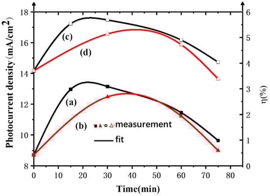 2 particles were deposited, and the grain boundary barriers that had to be overcome to transport the electrons generated on the film surface to the FTO increased. Therefore, the short-circuit current density first increased and then decreased with the immersion time. As a result, the energy conversion efficiency also increased first and then decreased with the extension of the immersion time (as shown in curve (c) in
