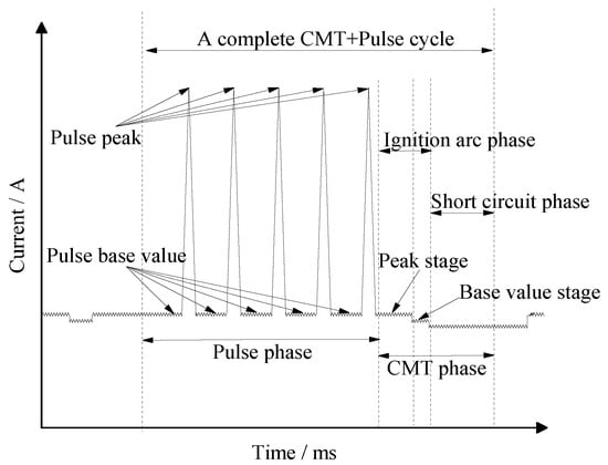 The TPS-3200 CMT welder produced by the Fronius company in Austria was employed as welding equipment. DP980 dual-phase steel was welded by overlapping. The overlapping width of the two plates was 11 mm, the included angle between the welding torch and the parent metal of the workpiece was 70°, and the dry elongation of the welding wire was 10 mm. The schematic diagram of the welding process is shown in Figure 1. Before welding, the basic metal surface of DP980 dual-phase steel was polished with sandpaper to remove the surface oxide film. Then, the base metal was clamped firmly on the welding platform surface, and the CMT + P welding mode was used for the welding experiment on the CMT welder. The working principle of pulse current is shown in Figure 2. The gas flow rate was controlled at 25 L/min. The arclength correction coefficient was 0%. In the CMT + P welding mode, the forming, microstructure, and mechanical properties of welded joints are studied by adjusting the wire feeding speed (3 m/min~5 m/min) and welding speed (350 mm/min~600 mm/min).