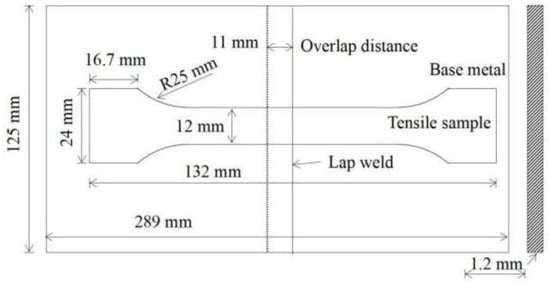 After welding, the metallographic samples of 30 mm× 10 mm× 1.2 mm were prepared by an electric spark CNC wire-cutting machine and were corroded with 4% nitric acid alcohol reagent after grinding and polishing. The energy dispersive spectrometer (EDS) equipped with a scanning electron microscope (SEM) was used to scan the welded joint area to determine the main elements of the welded joint and analyze the effect of alloying elements in the welding process. The resolution of the SEM is 1.0 nm (15 kv), and the acceleration voltage is 0.5~30 kv. The OM morphology of the welded joint HAZ was observed by the metallographic microscope. The grain size of the coarse-grain zone was measured according to GB/T 6394-2017 “Determination of estimating the average grain size of the metal”. Secondly, the microhardness distribution of welded joints was measured by a digital Vickers hardness testing machine with a load of 200 g and was applied for 15 s. The welded joint area was dotted every 0.3 mm from the position of the weld to the base metal. Three groups of samples were tested, and the microhardness curves were plotted using the Origin mapping software based on the measurement results. Finally, the tensile properties of welded joints were tested by a microcomputer-controlled electronic universal testing machine. The size of the tensile sample was set according to the GB/T 2651-2008 “Tensile test method on welded joints”, as shown in Figure 3. A test plate with an equal thickness was added on both sides of the lapweld, and the tensile test was conducted at a tensile rate of 2 mm/min. The fracture microstructures of the welded joints were observed by the SEM.