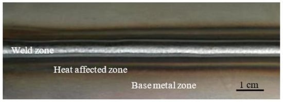 The typical macroscopic morphology of the welded joint fabricated by CMT + P technology is shown in Figure 4. It can be gained that the surface forming effect of the welded joint is well. There are no welding defects such as spatter residue, non-fusion, and arc crater. In Figure 4, the welded joints are divided into weld zone, HAZ, and base metal zone. The HAZ is between the base metal and the weld zone. It is symmetrically distributed at the center of the weld zone. The HAZ close to the fusion line is the weakest area between the welding wire and the base metal. Therefore, the performance of the HAZ determines the overall performance of the component. Starting from the wire feeding speed and welding speed, the paper mainly explored the effects of the CMT + P welding process parameters on the welding forming, microstructures, and properties of the HAZ in DP980 dual-phase steel welded joints.
