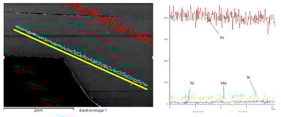 In the welding process, the effect of alloying elements on the properties of the welded joints is noticeable. Different wire components have different effects on the structure of welded joints [28]. The ER120S-G welding wire is selected as the experimental welding wire after careful consideration. First, the selection of welding wire follows the principle of “equal strength matching”. The tensile strength of the welding wire is 1043 MPa. Secondly, compared with the base metal, the contents of Si and Ni elements are increased in the welding wire. The Si has a more vital deoxidation ability than the Mn, and it is easily soluble in ferrite. Therefore, it can strengthen the toughness of the ferrite [29,30]. The addition of Ni to steel can improve the hardenability of the dual-phase steel and increase its strength. There are two methods to improve the mechanical properties of welded joints. One is to decrease the relative content of the ferrite by adjusting the welding process parameters. Another is to add alloying elements to enhance the toughness of the microstructures. Finally, the content of Mn in the welding wire is reduced. The Mn content should not exceed 1.8% to improve the strength and toughness of the welded joint. The main element compositions of the welded joints were analyzed by the EDS line scanning, and the results are shown in Figure 5. The element of the Si has an excellent toughening effect and low crack sensitivity in welded joints. The boiling point of the Mn is 1962 °C and the general arc welding temperature can reach about 3000 °C, which is easy to cause the evaporation and burning loss of the Mn [31,32]. The element of the Ni can decrease the brittle transition temperature and increase the hardness and strength of welded joints [33,34,35]. Moreover, Ni and Fe belong to an infinite solid solution, which can reduce the content of proeutectoid ferrite to improve the strength of welded joints.