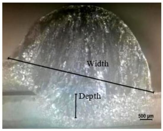 The cross-sectional morphology of the welded joint observed at a 20-fold metallographic microscope magnification is shown in Figure 6. It shows the measuring method of depth and width. The welding torch at a certain angle with the welded is to obtain a welded joint with well formability. After several pre-experiments in the study, the welding torch in the angle of 70° is the best. The welding line energy, weld depth, weld width, and depth-to-width ratio in different wire feeding speeds and welding speeds are shown in Table 2, in which the welding line energy and depth-to-width ratio are calculated according to Formulas (1) and (2).