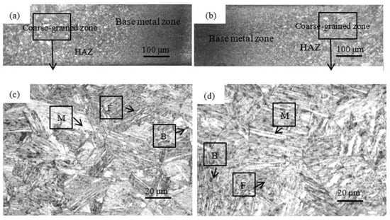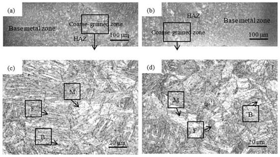 Microstructures of welded joints in different welding speeds: (a) HAZ in welding speed of 350 mm/min, (b) HAZ in welding speed of 600 mm/min, (c) the coarse-grained zone in welding speed of 350 mm/min, (d) the coarse-grained zone in welding speed of 600 mm/min.