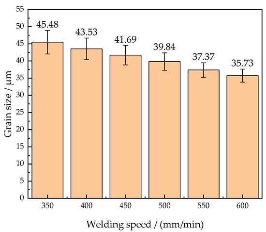 In the CMT + P mode, the wire feeding speed of 4 m/min is controlled and the effects of welding speed on the microstructures are shown in Figure 8. The range of the HAZ in the welding speed of 600 mm/min is narrower than that in the welding speed of 350 mm/min. The heat input decreases accordingly to narrow the HAZ range. The temperature input into the HAZ also reaches the temperature of Ac3. The coarse-grained zone is composed of martensite, ferrite, and a small amount of bainite. When the welding speed increases from 350 mm/min to 600 mm/min, the martensite grain size in the coarse-grained zone decreases from 45.48 μm to 35.73 μm in Figure 9. It indicates that the grain size is inversely proportional to the welding speed. Due to the reduction of the heat input, it leads to the shortening of the grain holding time. The martensitic grains have no time to grow under the rapid cooling, which results in the formation of refined martensitic grains. Therefore, the influence of welding speed on the grain size is significant. The grain size of the coarse-grained zone is effectively refined by increasing the welding speed in CMT + P mode. The total amount of the heat input is decreased by increasing the welding speed. The pulse plays a role in amplifying the peak current and optimizing the welding arc. With the decrease of the heat input, the relative undercooling rate increases. The nucleation rate of microstructures in the coarse-grained zone increases and its growth rate slows down. Therefore, the grains of the coarse-grained zone are refined to improve the performance of the welded joints.