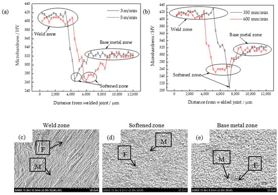 Figure 10a shows that the distance of the softened zone in the wire feeding speed of 5 m/min is wider than that in the wire feeding speed of 3 m/min. The wire feeding speed is too fast, which results in a high total heat input and a sizeable thermal diffusion range. The HAZ deviates from the maximum temperature of the weld zone and the cooling speed is gradually accelerated. However, the temperature in this process is still higher than that of Ac1 for ferrite precipitation. Thus, more ferrite is formed in the softened zone.