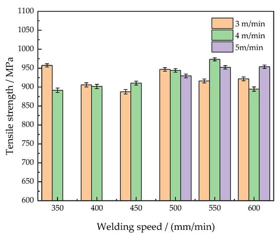Tensile strength of welded joints under different welding parameters is shown in Figure 11. It shows that the wire feeding speed of 4 m/min and the welding speed of 550 mm/min are the optimum process parameters. The optimum tensile strength is 973 MPa. Referring to Table 2 above, the line energy is 1612 J/cm at this time. The line energy in the optimum process parameters is reduced by 921 J/cm compared to that in the welding speed of 350 mm/min, and the tensile strength in the optimum process parameters is increased by 9.15%. With the increase of the welding speed, the weld depth and weld width are respectively reduced by 1078 μm and 1489 μm. It can be observed that the reduction distance of the weld width is greater than that of the weld depth. With the increase of the welding speed, the welding heat input decreases in the welding process. However, the weld depth is increased by the action of the pulse when the weld width is 5279 μm. The weld width in the optimum process parameters is lower than that in the low welding speed, which indicates that the HAZ width is smaller. At the time, the average grain size of the coarse-grained zone in the HAZ is tiny, which is 37.37 μm.