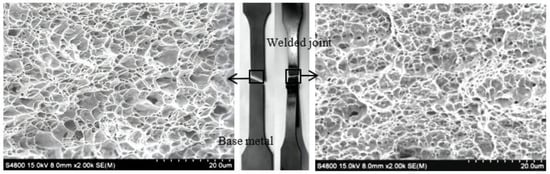According to the SEM morphology of the base metal, the microstructures of the fracture are evenly distributed. There are a large number of tensile equiaxed dimples in the fracture. Under the conditions of the unidirectional tensile, a three-dimensional stress concentration of the ferrite grain is caused, and microcracks are generated at the phase boundary between the ferrite and the martensitic [37]. As the cracks expand and merge, tiny dimples appear. The formation of fracture dimples indicates that the fracture mode of the base metal is microporous aggregation fracture. There are also dimples in the fracture of the welded joint. However, the size of the dimples in the welded joint is smaller than that of the base metal. It means that the welded joint has no larger buffer space than the base metal when plastic deformation occurs. Therefore, the welded joint has less ability to resist ductile fracture than the base metal.