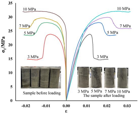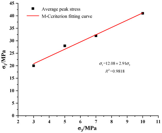 Figure 1 shows that the damage to mudstone was accompanied by the compaction, cracking, expansion, and other damage processes of the internal fractures of the rock, and the mudstone showed obvious softening characteristics. The main failure mode of mudstone was shear failure. When the test confining pressure was small, the cracks of the rock sample fully expanded, and the phenomenon of obvious volume expansion and expansion occurred. With the rise of the test confining pressure, the failure shear zone of the rock sample became more obvious, and the confining pressure effectively limited the lateral deformation of the rock sample. Under the different test confining pressure conditions, the stress–strain curve of mudstone had roughly the same development law before reaching the peak value. After reaching the peak stress, the strength gradually decreased, showing obvious strain-softening characteristics. According to the obtained mean value of mudstone peak stress, the fitted mudstone peak strength principal stress curve is shown in Figure 2.