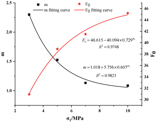 Using the experimental data, the damage variable was obtained from Equation (11), and the parameters m and F0 of Weibull distribution were calculated according to the calculation method of Ren et al. [8]. The model parameters of the obtained mudstone specimen are shown in Table 1. By analyzing the parameters of the Weibull distribution damage softening model of mudstone under triaxial compression, it was established that Weibull distribution parameters (m and F0) had a relationship with the confining pressure σ3, and then the parameters of the Weibull distribution damage-softening model were modified. As shown in Figure 3, based on the fitting relationship between m–σ3 and F0–σ3, the corrected m and F0 parameters were obtained, as shown in Equation (18).