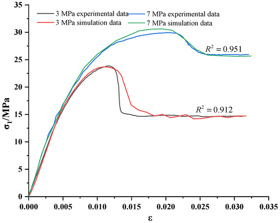 Based on the stress–strain relationship and experimental mechanical parameters of the mudstone damage and softening model, the constitutive model was conducted using the correlation function in the FISH language, and the Mohr–Coulomb criterion was embedded. According to the analysis steps of FLAC3D, the triaxial compression of mudstone under different confining pressures was numerically analyzed. A comparison between the calculated and experimental values of initial confining pressures of 7 MPa and 3 MPa is shown in Figure 4. It can be seen that in the elastic stage and the buckling stage, the numerical calculation curve has the same trend as the test value, and the numerical calculation strength under different confining pressure conditions is relatively close to the test peak strength. The model proposed in this paper could simulate the axial stress–strain behavior well under the condition of mudstone damage and softening and could well reflect the strain-softening process of mudstone.