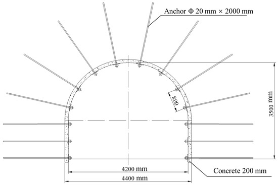 The Shangshan roadway in the Pingdingshan mining region of Henan Province is 650 m in length. The surrounding rocks are dominated by mudstone. The cross-sectional shape is a straight wall and a semi-circular arch. The roadway cross-section is 4400 mm × 3500 mm. Through an on-site in situ stress test, its vertical self-weight stress and horizontal tectonic stress were found to be about 16.05 MPa and 24.10 MPa, which represent high in situ stress conditions. The initial support of the roadway is composed of bolt and metal mesh supports, the bolts are left-threaded steel bolts with diameters of Φ 20 mm × 2000 mm, and the row spacing is 800 × 800 mm. The top and bottom anchor nets are not less than 100 mm, and the interval is 200–300 mm with wire mesh; 200 mm thick concrete is laid all around the roadway. The original support diagram of the Shangshan roadway is shown in Figure 5. Due to the obvious softening characteristics of mudstone, the roadway has the characteristics of large deformation and instability, which is manifested in the convergence of the roof and floor of the roadway and the two gangs, and there are damages such as bolt breaking, pallet falling, metal mesh shearing, and net pockets.