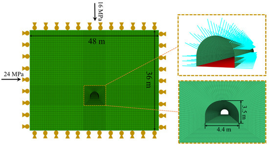 According to the geological conditions of the surrounding rock of the roadway and the form of the supporting structure, using the established mudstone damage and softening model, the established FLAC3D numerical model is shown in Figure 6. The horizontal in situ stress and vertical stress were set to 24.0 MPa and 16.0 MPa, respectively. After the initial stress of the model was completed, the simulation of roadway excavation began. During the excavation process, it simulated the bolt with the cable element and simulated the mesh shotcrete and concrete floor with the shell element while setting the mechanical parameters. The mechanical and physical parameters of the roadway support structure are shown in Table 2.