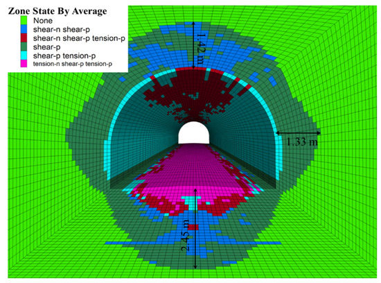 As shown in Figure 7, the plastic failure depth of the surrounding rock was 2.45 m. This is because the surrounding rock produced a local shear failure zone under the effect of self-weight stress, and then the local shear failure zones were connected and penetrated into each other, thus forming a large area of the plastic damage zone. Furthermore, due to the large horizontal stress on the roadway, the roadway floors had a larger plastic failure area than the sides and vault.