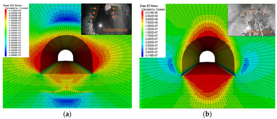 The surrounding rock stress is shown in Figure 8. When the roadway was excavated under high ground stress, the roadway’s inner side was damaged to varying degrees, indicating that the original support scheme could not effectively restrain the surrounding rock of the deep buried weakly cemented soft rock roadway. The plastic expansion caused the damage degree of surrounding rock to become more serious as the roadway advanced and finally loosened and became unstable. Comparing the numerical calculation results with the actual roadway engineering surrounding rock deformation and damage, it can be seen that the established damage softening model is more reasonable for the numerical simulation analysis of surrounding rock plastic damage zone and support structure stress. It can more realistically reflect the failure characteristics of rock mass and predict the position of the failure area in the surrounding rock of the chamber, and the calculation results can provide scientific guidance for construction.