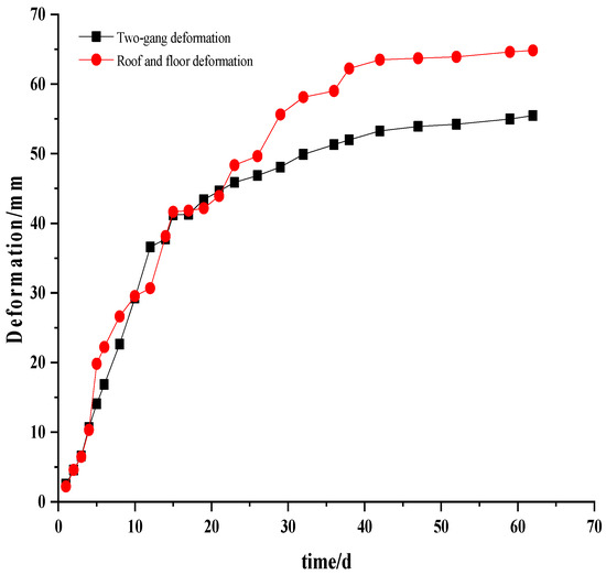 After the structure had been supported, as shown in Figure 9, due to the influence of the excavation disturbance and the release of its stored deformation energy, the deformation of the surface rock mass increased sharply; after 30 days of excavation, the surface displacement and deformation rate began to decrease, and after 50 to 60 days, the deformation rate was stable. Below 0.1–0.3 mm/d, the overall deformation was within the control range. The onsite monitoring results showed that the optimized roadway support structure had a high safety reserve and a reasonable design scheme.