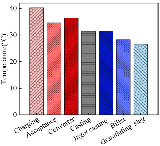The temperature in the steelworks is shown in Figure 1. As shown in the figure, the average temperature in the steelworks was 32.7 °C from August to October 2013. According to the meteorological data, the atmospheric temperature in Wuhan was 24.8 °C during the same period [32]. Therefore, the temperature in the steelworks was 1.32 times higher than that of the general atmospheric environment. Moreover, there were significant differences in the temperatures in various sections. The temperatures in the process sections in front of and in the middle of the furnace, such as the charging bay, acceptance bay, converter bay, casting bay, and ingot casting bay, etc., were higher than those in the post furnace process sections, such as billet bay and granulating slag bay. The temperatures in the charging bay, acceptance bay, converter bay, casting bay, ingot casting bay, billet bay, and granulating slag bay were 40.3, 34.6, 36.4, 31.4, 31.5, 28.3, and 26.5 °C, respectively. The temperature in the charging bay was the highest, and it was 1.63 times higher than that of the general atmospheric environment.