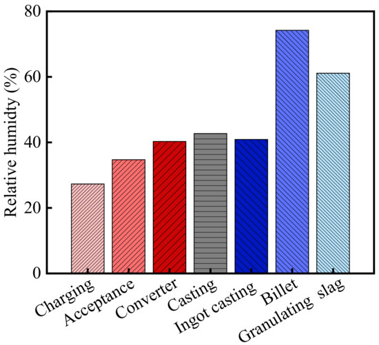 The relative humidity in the steelworks is shown in Figure 2. As shown in the figure, the average relative humidity in the steelworks was 45.9% from August to October 2013. According to the meteorological data, the relative humidity of the atmospheric environment in Wuhan was 73.7% during the same period [32]. Therefore, the relative humidity of the general atmospheric environment was 1.61 times higher than that in the steelworks. Besides, the relative humidity in various sections was significantly different, and there was a thermal hydraulic coupled process between relative humidity and temperature. As the temperature increased, the relative humidity showed a downward trend. The relative humidity in the post furnace process sections (billet bay and granulating slag bay) was closed to that of the general atmospheric environment, and the humidity in other sections was much lower than that of the general atmospheric environment. The relative humidity in the billet bay and granulating slag bay were 74.2 and 61.1%, respectively. The relative humidity in the charging bay, acceptance bay, converter bay, casting bay, and ingot casting bay were lower, and they were 27.7, 34.7, 40.3, 42.7, and 40.9%, respectively. The relative humidity in the charging bay was the lowest, and it was 0.38 times higher than that of the general atmospheric environment.