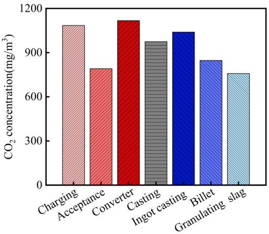 The CO2 concentration in the steelworks is shown in Figure 3. As shown in the figure, the average CO2 concentration in the steelworks was 944.5 mg/m3. According to the relevant information from the Wuhan Environmental Protection Bureau (WHEPB), the CO2 concentration of the atmospheric environment in the Qingshan District was 740.5 mg/m3 [32]. Therefore, the CO2 concentration in the steelworks was 1.28 times higher than that of the general atmospheric environment. In addition, there were significant differences in the CO2 concentrations in various sections, and the CO2 concentrations in the charging bay, acceptance bay, converter bay, casting bay, ingot casting bay, billet bay, and granulating slag bay were 1084.3, 791.2, 1117.6, 974.3, 1039.4, 846.6, and 758.2 mg/m3, respectively. Therefore, CO2 concentration in all sections of the steelworks was higher than that of the general atmospheric environment, and the maximum value was 1.51 times higher than that of the general atmospheric environment.