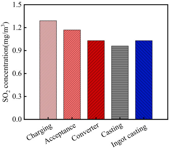 The SO2 concentration in the steelworks is shown in Figure 4. As shown in the figure, the average SO2 concentration in the steelworks was 0.78 mg/m3. According to the relevant information from WHEPB, the SO2 concentration of the atmospheric environment in the Qingshan District was 0.056 mg/m3 [32]. Therefore, SO2 concentration in the steelworks was 13.93 times higher than that of the general atmospheric environment. There were significant differences in the SO2 concentrations in various sections. The SO2 concentrations in the charging bay, acceptance bay, converter bay, casting bay, and ingot casting bay were 1.29, 1.17, 1.03, 0.96 and 1.03 mg/m3, respectively. No obvious SO2 was detected in the billet bay and granulating slag bay. Therefore, the SO2 concentration in the charging bay was the largest, which was 20.04 times higher than that of the general atmospheric environment.