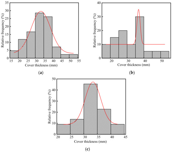 The thickness of concrete cover in the steelworks is listed in Table S1 (See Supplementary Materials), and the frequency distribution histograms of concrete cover thickness are shown in Figure 6. As shown in Figure 6a, the average thickness of the concrete cover in the steelworks was 32.42 mm, and the ratio of the test value to the design value was 1.08. This indicated that there was little difference between the test value and the design value of the concrete cover thickness in the steelworks. The coefficient of variation of concrete cover thickness was 0.22, indicating that the discreteness of cover thickness was good. It was found that the p-value was 0.81 at a significant level α = 0.05 by using Shapiro-Wilk. Therefore, the thickness of the concrete cover was in accordance with the normal distribution. In summary, the thickness of concrete cover in the steelworks basically met the structural design requirements.