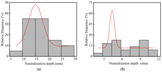 Neutralization remains of concrete in the ingot casting bay and billet bay of the steelworks are calculated according to Equation (11). The frequency distribution histograms of x0 are shown in Figure 11. As shown in the figure, there were significant differences in x0 between the ingot casting bay and billet bay, and x0 in the billet bay was much larger than that in the ingot casting bay. The average, standard deviation, and coefficient of variation of x0 in the ingot casting bay were −0.67, 0.22, and −0.33 mm, respectively. As well, the average, standard deviation, and coefficient of variation of x0 in the billet bay were 20.10, 3.66, and 0.18 mm, respectively. This was because the relative humidity in the billet bay was much larger than that in the ingot casting bay. The p values of x0 in the ingot casting bay and billet bay were 0.63 and 0.89 at the significant level α = 0.05 by using Shapiro-Wilk, respectively. Therefore, both neutralization remains of concrete in the ingot casting bay and billet bay followed the normal distribution.