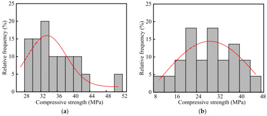 Frequency distribution histograms of concrete compressive strength in the steelworks: (a) Ingot casting bay; (b) Billet bay.