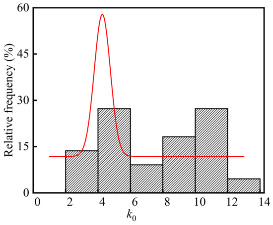 The neutralization depth of concrete in the billet bay is the carbonation depth. Substituting the test values of the temperature, relative humidity, CO2 concentration, concrete compressive strength, concrete neutralization depths, and neutralization ages in the billet bay into Equation (6), k0 is calculated and the frequency distribution histogram of k0 is shown in Figure 9. As shown in the figure, the average, standard deviation, and coefficient of variation of k0 were 7.66, 3.16, and 0.41, respectively. The p-value of k0 was 0.13 at the significant level α = 0.05 by using Shapiro-Wilk. Therefore, k0 in the steelworks followed the normal distribution.