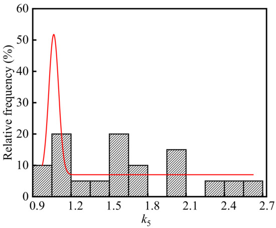 Substituting the test values of the temperature, relative humidity, CO2 concentration, concrete compressive strength, neutralization ages in the ingot casting bay into Equation (6), the average of carbonation depth of concrete in the ingot casting bay is 9.97 mm. Combining the average carbonation depth and the neutralization depths of concrete in the ingot casting bay, k5 is calculated and the frequency distribution histogram of k5 is shown in Figure 10. As shown in the figure, the average, standard deviation, and coefficient of variation of k5 were 1.64, 0.50, and 0.31, respectively. The p-value of k5 was 0.30 at the significant level α = 0.05 by using Shapiro-Wilk. Therefore, k5 in the steelworks followed the normal distribution.