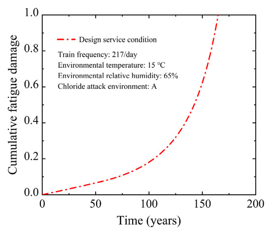Figure 5 depicts the cumulative fatigue damage curve under the design service condition. The cumulative fatigue damage rate of the U-shaped beam grows gradually through the design service life. When the U-shaped beam is operated to the design service life of 100 years, the cumulative fatigue damage in the non-prestressed reinforcement is only 0.181. Continuous corrosion reduced the effective cross-sectional area of the reinforcement, accelerating the accumulation of fatigue damage. Finally, the corrosion-fatigue failure of the U-shaped beam occurred in the 164.8th year. The cracking of the U-shaped beam exposes the reinforcement to the corrosive environments completely, which accelerates the reinforcement corrosion and ultimately affects the safety and durability of the U-shaped beam. Therefore, it is essential to strengthen the maintenance and repair of the U-shaped beam to avoid concrete cracking during the service period.
